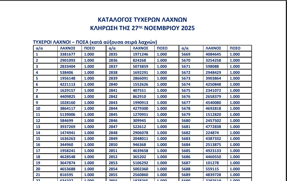Στο παρακάτω Αρχείο μπορείτε να δείτε τον κατάλογο των τυχερών λαχνών
